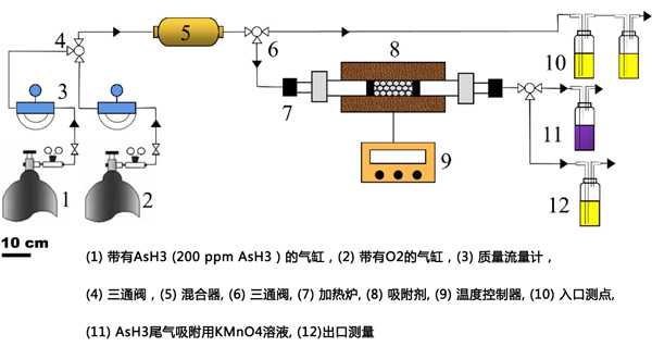 實驗裝置的方案在圖1提供。將氣流以200mL/分鐘的氣體流速引入混合器中。該氣體由稀釋在O2(0-1.2%)中的AsH3(200ppm)組成。然后預(yù)混合氣體進入填充有0.2g活性炭吸附柱的固定床。設(shè)置兩個采樣口:一個用于進口氣體,一個用于出口處理后的殘余尾氣。廢氣經(jīng)酸性KMnO4處理。在這項研究中,AsH3去除效率和吸附容量用于評估活性炭的砷吸附能力。所有實驗重復(fù)3次,計算標準差和平均值。