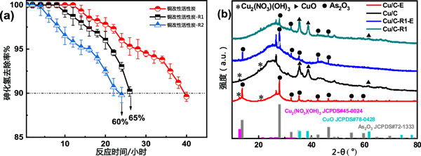 銅改性活性炭通過水洗和吹掃氣體法進行再生。為此,活性炭樣品首先在100℃的熱空氣中活化3小時。然后用去離子水浸泡清洗4-5次,放入電熱風烘箱中110-120℃烘干。之后,將樣品置于氮氣氣氛下的管式爐中,并使用程序升溫控制器升高溫度?紤]到通過在180℃下烘烤獲得的材料,溫度首先設(shè)定在20-180℃。之后,停止加熱,將樣品冷卻至室溫。取出樣品,停止氮氣流,對再生材料進行測試。如圖3a所示,R的再生效率(R為再生吸附劑與新鮮吸附劑的穿透時間之比)在一個再生循環(huán)后為65%。在第二次再生循環(huán)后,樣品恢復(fù)效率R達到60%,證實了活性炭吸附劑對去除AsH3具有合理的再生能力。為了確定活性炭吸附劑再生后表面相的變化,通過XRD分析活性炭吸附劑。如圖3b所示,再生后活性炭-R1中35.6°、38.8°和61.8°的CuO衍射峰強度明顯增加,但沒有Cu2(NO3)峰被找到。這表明在再生過程中回收的一些CuO物種可能被中間體Cu2(NO3)(OH)3轉(zhuǎn)化。此外,活性炭-R1樣品中As2O3在28.0°、32.2°、35.5°、42.6°、46.4°、55.0°和59.6°處的結(jié)晶峰明顯減弱。推測中間體Cu2(NO3)(OH)3向吸附活性中心CuO的轉(zhuǎn)變和結(jié)晶As2O3的分離可能是活性炭吸附劑再生性能好的原因。
