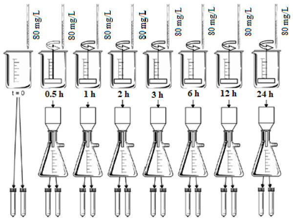 測定平衡時(shí)間的吸附試驗(yàn)對每種活性炭進(jìn)行兩次。使用了7個(gè)裝有500mL研究水的1L燒杯。每個(gè)燒杯接受一份活性炭懸浮液,以在水研究中獲得80mg/L的初始濃度。將燒杯放在一個(gè)罐子測試設(shè)備中,將混合速度保持在205rpm在恒溫23℃的環(huán)境中。采用的接觸時(shí)間為0.5、1、2、3、6、12和24小時(shí)。接觸時(shí)間后,將每個(gè)燒杯從攪拌中取出,立即通過孔徑為0.22μm的纖維素酯膜過濾研究水,以分離碳并中斷吸附過程。分析過濾后的水餾分的pH值和柱狀藻紅濃度。圖1顯示了平衡時(shí)間測定分析中評估的條件的示意圖。