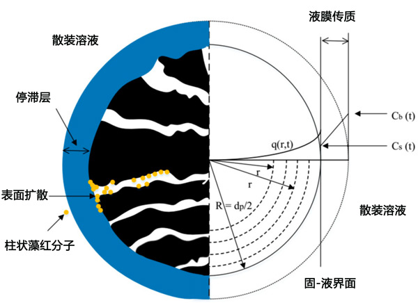 在第一實(shí)驗(yàn)階段獲得的吸附平衡測試的實(shí)驗(yàn)數(shù)據(jù)適合等溫線模型Langmuir、Freundlich和Redlich-Peterson。將最適合吸附平衡數(shù)據(jù)的等溫線模型的參數(shù)值應(yīng)用于HSDM模型,以模擬SBA柱中的吸附過程。該模型考慮了發(fā)生在兩個(gè)連續(xù)擴(kuò)散步驟中的吸附過程,即:通過活性炭顆粒周圍的固定流體層擴(kuò)散(膜擴(kuò)散)和通過活性炭內(nèi)部孔的擴(kuò)散(表面擴(kuò)散),如圖2所示。