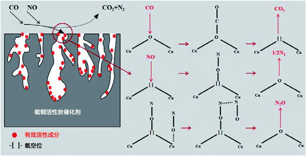 在活性炭催化劑表面通過(guò)選擇性催化還原技術(shù)(CO-SCR)反應(yīng)進(jìn)行的低溫脫硝是一種具有代表性的非均相催化體系,遵循Langmuir-Hinshelwood反應(yīng)機(jī)理。因此,提出了圖3所示的脫硝機(jī)制,用于在活性炭催化劑上對(duì)NO進(jìn)行CO還原;钚越M分Cu均勻分散在活性炭上,增加了催化劑的比表面積和對(duì)NO和CO的吸附。這一結(jié)論表明Cu均勻分布在活性炭催化劑的表面,將脫硝效率提高到80%。CO吸附在催化劑表面以還原-O-Cu2+到=Cu+并生成CO2。吸附的NO解離成N和O,解離的N原子與NO分子結(jié)合形成N2O。據(jù)報(bào)道,NO的解離是CO誘導(dǎo)的NO消除的關(guān)鍵步驟。活性位點(diǎn)的釋放促進(jìn)了CO的吸附,最后N2O和=Cu+反應(yīng)生成N2和–O–Cu2+,這進(jìn)一步促進(jìn)了脫硝反應(yīng)。在CO與NO的反應(yīng)中,Cu2+↔Cu+交換可能會(huì)改變催化劑表面的價(jià)態(tài),更多的氧空位可用于轉(zhuǎn)化過(guò)程,促進(jìn)NO向N2的轉(zhuǎn)化。