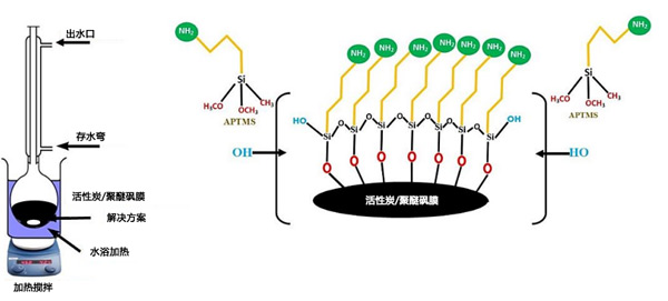 為了改性活性炭的表面,將15g非常細的干燥活性炭粉末與300mL甲苯和2mL氨丙基三甲氧基硅烷(APTMS)溶液在磁力攪拌下在40℃惰性環(huán)境下混合24小時。圖1表示實驗裝置的示意圖。使用實驗室旋轉蒸發(fā)儀去除溶劑。用甲苯和丙酮進一步洗滌所得的APTMS活性炭,然后在60℃下真空干燥6小時。這種干燥的活性炭被稱為改性活性炭,由表面上的胺官能團組成。改性活性炭在干燥條件下儲存以用于后續(xù)的實驗工作。