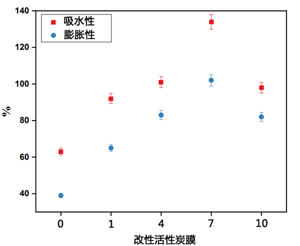 圖3:原始聚醚砜膜和改性活性炭結合的聚醚砜膜的WU和溶脹百分比。