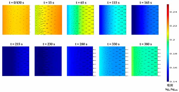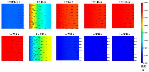 活性炭復合吸附劑的壓力和溫度決定了平衡吸收,它代表了在給定時間分別在吸附和解吸階段可以達到的最大和最小吸收容量。然而,顆粒內(nèi)和顆粒間的傳質(zhì)阻力表明吸附材料在每種給定情況下可以多快達到其平衡吸收能力。這突出了在本研究中同時求解兩種傳質(zhì)機制與其他控制方程的重要性,以顯示促進傳熱對傳質(zhì)的凈效應。圖2顯示了在430秒循環(huán)時間內(nèi),考慮到預熱和預冷階段均為30秒的時間間隔內(nèi)代表性部分的固結(jié)吸附劑域的溫度分布。
