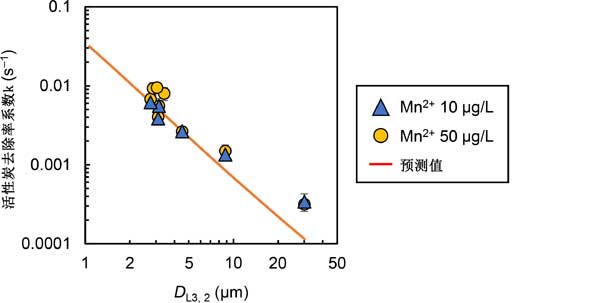二價錳離子(Mn2+)在配水系統(tǒng)中被氧化成黑色氧化錳,是飲用水中出現(xiàn)美觀問題的主要原因。為了去除可溶性二價錳我們研究了游離氯催化氧化去除活性炭表面上的二價錳,并發(fā)現(xiàn)當(dāng)使用微米級活性炭時效果比較好。在此,我們新推導(dǎo)出了催化反應(yīng)去除痕量物質(zhì)的動力學(xué)模型,并將其應(yīng)用于二價錳去除。