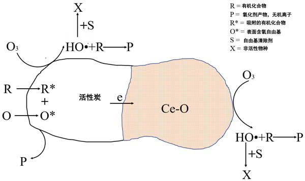 圖1:活性炭二氧化鈰催化的臭氧化過(guò)程中發(fā)生的主要反應(yīng)途徑示意圖。