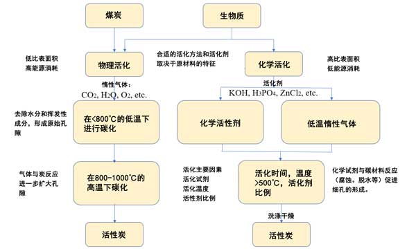 圖2:通過(guò)物理和化學(xué)活化生產(chǎn)活性炭。