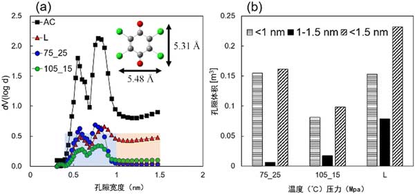 圖3:(a)使用DFT和二氧化碳吸附/解吸方法計(jì)算的微孔尺寸分布。(b)CHL浸漬活性炭的孔體積。
