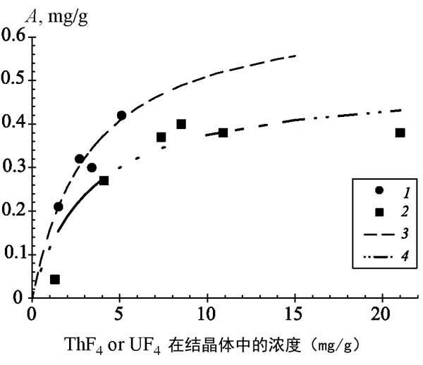 圖2:從熔體中吸附釷和鈾氟化物的等溫線。(1,2)實(shí)驗(yàn)數(shù)據(jù);(3,4)根據(jù)Langmuir方程逼近實(shí)驗(yàn)點(diǎn)。(1,3)四氟化鈾;(2,4)THF4。