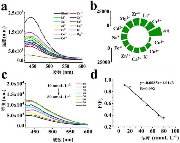 圖2:(a)12種金屬離子的納米活性炭點的熒光發(fā)射光譜,(b)360nm處的熒光強度,(c)不同濃度Cu2+的熒光發(fā)射光譜,(d)Cu2+檢測的線性曲線。