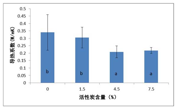 圖3:活性炭增強(qiáng)歐松板的導(dǎo)熱率值。圖3中的字母(a和b)表示具有同等重要性的樣本組聚集在一起。
