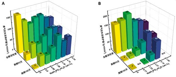用磷酸三鈉12水合物(Na3PO4·12H2O)在活性炭上進行類似的實驗,活性炭失活后干燥。實驗在11.03wt.%的濃度下進行,相當(dāng)于4.00wt.%的NaH2PO4·H2O的摩爾當(dāng)量。很明顯,磷酸三鈉在抑制衰老方面并不有效。經(jīng)過3個月的加速失活,保護值甚至低于未改性的活性炭。然而,Na3PO4·12H2的效率可能會降低如果在酸性環(huán)境中或與酸或酸性化合物一起添加,效果會更好。這是因為酸性條件可以向磷酸鹽提供質(zhì)子,導(dǎo)致磷酸鈉有效地充當(dāng)Na2HPO4或NaH2PO4?傮w而言,結(jié)果表明,在由磷酸及其三種鈉鹽組成的磷酸鹽添加劑中,一元鹽NaH2PO4·H2O是抑制失活最有效的添加劑。