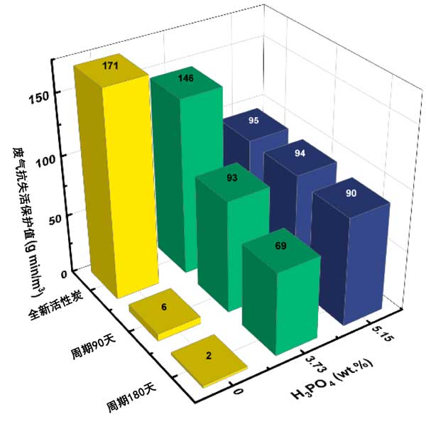 可以看出,濃度為5.15wt.%的磷酸對于抑制失活非常有效(加速失活6個月后保護值保持不變)。然而,添加5.15wt.%磷酸后,初始保護值(對于新碳)顯著降低,從171g/min/m3降至95g/min/m3?傮w而言,磷酸是不如NaH2PO4有利的添加劑。
