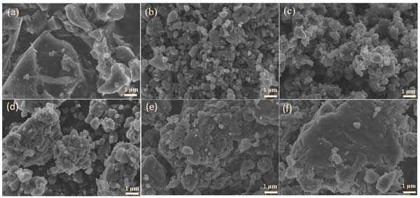 圖1:(a)活性炭、(b)研磨12小時、(c)研磨24小時、(d)研磨48小時、(e)研磨60小時和(f)研磨72小時的SEM圖像。