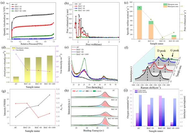 圖2:球磨活性炭的結(jié)構(gòu)表征。(a)N2吸附-脫附等溫線;(b)孔徑分布;(c)比表面積和孔體積;(d)閉孔體積和真密度;(e)XRD圖譜;(f)拉曼光譜;(g)樣品拉曼光譜的XRD(002)峰強度的變化;(h)XPSC1s譜;(i)氧含量和層間距。