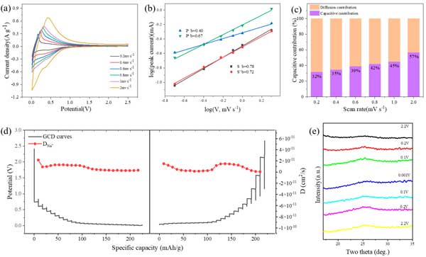 圖4:(a)活性炭從0.2到2mVs-1的CV曲線。(b)峰值電流與確定b值時的掃描速率之間的關(guān)系。(c)不同掃描速率下電容和擴散主導(dǎo)容量的百分比貢獻。(d)活性炭電極的GITT測試結(jié)果。(e)活性炭電極在鈉化和脫鈉各個階段的異位XRD譜。