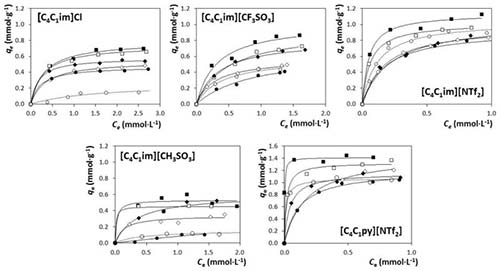 得到的結(jié)果表明,活性炭的不同的吸附能力與IL的性質(zhì)和溶液中的鹽量有關(guān)。一般而言,對于咪唑鎓的ILs,陰離子對其對活性炭的吸附能力的影響按照以下順序:Cl - ≈[CH 3 SO] <[CF 3 SO 3 ] -<[NTf 2 ] 。這一趨勢的結(jié)果和預(yù)計的相符合,并且表明,隨著陰離子疏水性的增加,活性炭對ILs的吸附逐漸增加。另一方面,考慮到IL陽離子家族,活性炭能吸附更多的吡啶鎓比基于咪唑類的對應(yīng)物?傊@里證明,如果伴隨使用無機(jī)鹽來促進(jìn)鹽析現(xiàn)象并增強(qiáng)隔離度,則活性炭也可以用作水介質(zhì)中低濃度存在的親水性IL的有效吸附劑。得到的結(jié)果表明, 在鹽的存在下,親水性ILs的例如[C 4 C 1 im] Cl和[C 4 C 1 im] [CH 3 SO3 ]的K d值增加高達(dá)5.5倍。這種新方法可以被設(shè)想為減少由使用IL的工業(yè)過程產(chǎn)生的含水物流污染的有希望的途徑。