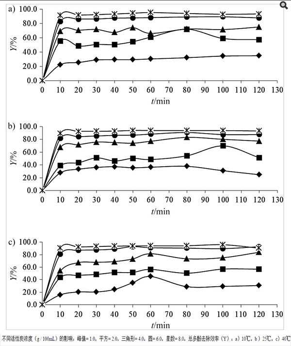所用活性炭的濃度是控制吸附的重要因素。眾所周知,溫度是影響任何吸附過(guò)程的附加因素。因此,在三個(gè)不同的溫度,室溫(25℃),高于(40℃)和波紋管(10℃)下進(jìn)行測(cè)試。為了觀察溫度和吸附劑量對(duì)多酚吸附的同時(shí)影響,吸附劑濃度從1至8g / 100mL變化。使用相同數(shù)量的廢水(25mL)和恒定的酚濃度(3.0mg / mL)進(jìn)行不同的測(cè)試,但改變活性炭的量(0.25、0.5、1.0、1.5和2.0g)。在圖中可以觀察到不同溫度下的吸附趨勢(shì)。