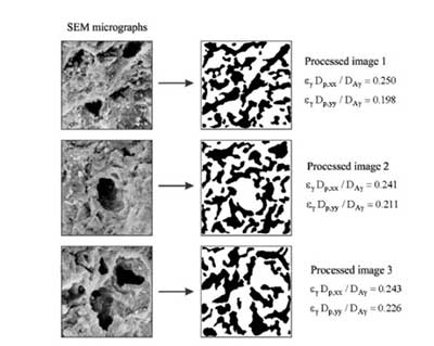 通過掃描電子顯微鏡使用2400倍放大倍數(shù)檢查活性炭的形態(tài)。使用圖像處理工具箱處理圖像。程序如下。首先,通過將灰度轉(zhuǎn)換為灰度(從0(黑色)到255(白色)]來改善黑暗和光照區(qū)域之間的對(duì)比度。由于深色區(qū)域在視覺上指示深刻,所以假設(shè)這些代表孔隙占據(jù)的部分,而淺色區(qū)域與固體基質(zhì)(活性炭)有關(guān)。這個(gè)想法一點(diǎn),每個(gè)象素的灰度值被跟蹤(來自黑色),并累積,得到體積分?jǐn)?shù) ε γ 的較暗的像素。其次,具有等于或小于閾值的值的所有像素被轉(zhuǎn)換成白色(被孔占據(jù)的空間),而具有較高值的像素被轉(zhuǎn)換成黑色(實(shí)心矩陣)。最后,為了增強(qiáng)輪廓的定義,應(yīng)用濾波器。這個(gè)程序允許我們獲得最終的二值圖像,其中白色和總像素?cái)?shù)之間的比率等于活性炭的孔隙率。事實(shí)上,來自SEM顯微照片的處理圖像提供了解決閉合問題的領(lǐng)域。