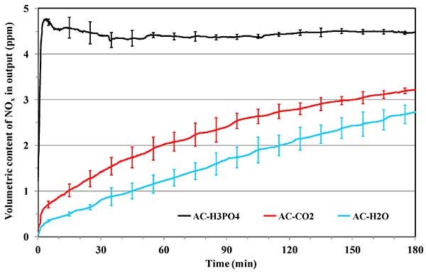 盡管用于汽車和工業(yè)廢氣都實施了減排措施,城市人口與車輛的增加導致了更多氮氧化物的排放。使用木質纖維為前體制造的活性炭在環(huán)境溫度去除氮氧化物。這些活性炭吸附劑表現(xiàn)出令人感興趣的吸附容量范圍在40mg/g和120mg/g之間。然而,這些活性炭的性能通常在干燥和潮濕條件下在空氣存在下在500-1000ppmNO濃度下進行評估。
