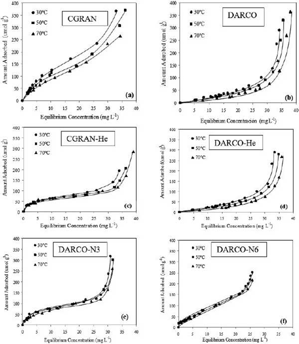 評估原樣處理的活性炭對松香酸的吸附情況,結(jié)果如圖1所示。該圖描繪了在處理前和后處理的CGRAN和DARCO活性炭的三種溫度(30,50和70℃)下作為平衡濃度函數(shù)的吸附容量。從先前對吸附速率的研究(此處未顯示),確定在30分鐘達(dá)到吸附平衡。根據(jù)分類等溫線,CGRAN和CGRAN-He(圖1a和1c)顯示了“L”型等溫線,這是樅酸和吸附位點(diǎn)之間強(qiáng)親和力的特征。DARCO(圖1b)和DARCO-He(圖1d)活性炭表現(xiàn)出“S”型等溫線,歸因于溶質(zhì)和溶劑之間競爭吸附的結(jié)果,松香酸對吸附位點(diǎn)的親和力較低。圖1e和1f所示的HNO3氧化樣品(DARCO-N3和DARCO-N6)的 等溫線為“L”型吸附等溫線,樅酸和溶劑之間具有強(qiáng)親和力的特征。26,27另外,DARCO-N3展示了一個被歸類為“L2”的等溫線,其中平臺指示表面上的所有可用位點(diǎn)均分布在單層中,并且DARCO-N6根據(jù)“L1”子群顯示等溫線,其中沒有觀察到高原,表明未覆蓋單層。 這種行為與DARCO-N6顯示的更多的表面功能組一致。