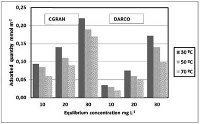 關(guān)于活性炭對松香酸的吸附能力,圖1a顯示CGRAN活性炭的吸附容量隨著平衡濃度的增加而增加。相反,圖1b顯示,DARCO的吸附能力在平衡濃度高達(dá)30 mg L -1時稍微增加,然后在所有三個溫度下的病房后急劇增加。與DARCO相比,所接收的活性炭的結(jié)果顯示對CGRAN具有較高的吸附容量,這可歸因于較高表面積和較大量的存在于前者的氧官能團(tuán)的組合。