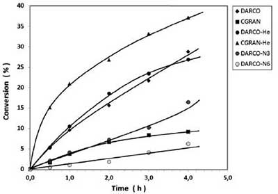 活性炭催化劑的活性在樅酸隨時間的變化中進(jìn)行測試,如圖3所示。該圖顯示DARCO催化劑顯示比CGRAN催化劑更高的轉(zhuǎn)化率。圖3還比較了接受活化的碳催化劑與He處理的對應(yīng)物的轉(zhuǎn)化率:CGRAN-He顯示出比CGRAN催化劑顯著更高的轉(zhuǎn)化率,這是與從TPD,F(xiàn)TIR和酸度結(jié)果推斷的表面氧基團(tuán)數(shù)目較少有關(guān)的行為。DARCO和DARCO-He之間的轉(zhuǎn)化沒有明顯的差異,這與兩種催化劑中表面氧基團(tuán)的量相似。沿同一線,比較DARCO和相應(yīng)的硝酸氧化樣品的活性,如圖3所示。數(shù)據(jù)清楚地顯示了轉(zhuǎn)化率與HNO 3濃度之間的反比關(guān)系用于改性處理。因?yàn)樵谔幚碇鬀]有明顯的變化,所以質(zhì)地特性的影響可以打折扣; 因此,這種行為顯然是酸強(qiáng)度和表面含氧基團(tuán)的效應(yīng),從TPD,F(xiàn)TIR和總酸度結(jié)果得出的DARCO活性炭表面的化學(xué)修飾的證明。DARCO-N6催化劑的最低轉(zhuǎn)化率可以與它們的最高酸強(qiáng)度相關(guān),而DARCO表現(xiàn)出的最高轉(zhuǎn)化率是由于它們的最低酸強(qiáng)度。這些結(jié)果表明,盡管強(qiáng)酸性位點(diǎn)有利于樅酸的吸附,但是它們會削弱催化活性。這些發(fā)現(xiàn)也表明這些位點(diǎn)對于催化裂化沒有活性。