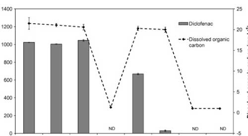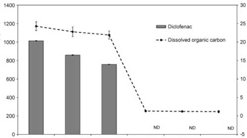 污水處理廠內污水中的化學殘留物的存在表明,并非所有的物質都能在凈水過程中被完全去除。因此,在飲用水處理廠中主要的水源來自地表水和地下水。由于其在污水廠中的低效處理及一些其親水特性的化學物,于是在飲用水中也發(fā)現(xiàn)了大量的濃度為ng L -1的雙氯芬酸鈉。大多數(shù)關于去除這類化學物的研究集中在一小部分水處理過程或操作上。此外,他們使用從泥炭中提取的腐殖物質代替水,這些物質具有不同的特性,其中腐殖酸含量低于黃腐酸,低分子量和低濃縮分子,可能阻礙化學物的去除。