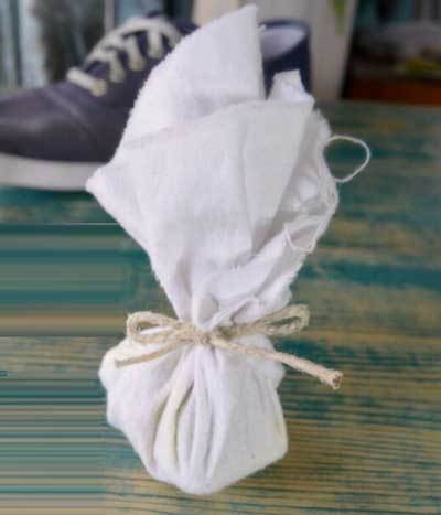 你的活性炭已經(jīng)填裝到咖啡過(guò)濾紙上了,精油也滴上去了,F(xiàn)在只要盡可能緊地包裹過(guò)濾紙,同時(shí)將角落塞入以防止活性炭泄漏。如果您想要格外謹(jǐn)慎,可以使用一小塊膠帶密封好,并在下一步中保持開啟狀態(tài)。