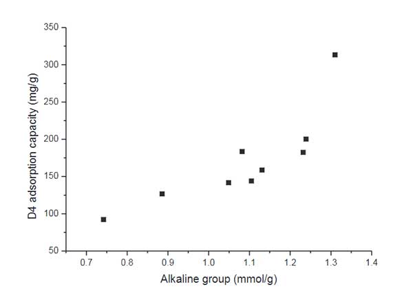 圖2.堿性基團濃度與堿性活性炭的硅氧烷吸附容量之間的關系。