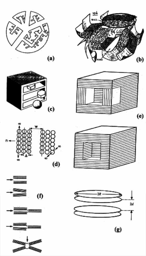 圖1:活性炭孔隙率模型,(a)徑向分布圓柱孔網(wǎng),(b)皺紙,(c-d)狹縫狀孔,(e)立方體狀狹縫狀孔,(f-g)微晶方法。