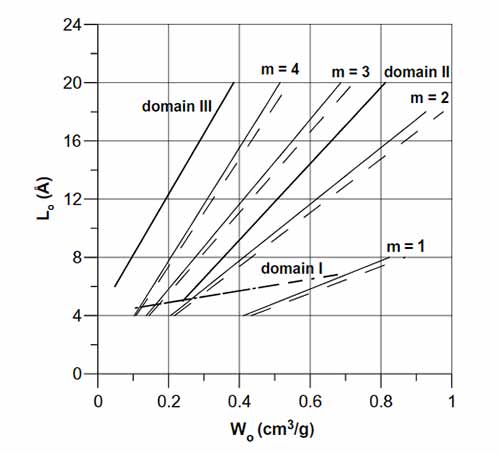活性炭孔隙率遵循三個(gè)線性結(jié)構(gòu)域所示的常見趨勢。這一事實(shí)表明存在著由不同前體和精制路線的固體部分共同形成的共同形態(tài)。根據(jù)這些多孔固體的近期和各種已發(fā)表的特征,它們的孔壁由基本結(jié)構(gòu)單元的空間排列構(gòu)成,所述基本結(jié)構(gòu)單元由層疊的石墨烯層組成。為了減少模型中的參數(shù)數(shù)量,結(jié)構(gòu)被描述為圓盤狀顆粒,其直徑的特征在于石墨烯層中涉及的苯環(huán)的數(shù)量,并且其厚度由堆疊層的數(shù)量和層間距離。用于工業(yè)宏觀尺寸盤狀顆粒堆積的可用經(jīng)驗(yàn)相關(guān)性已經(jīng)應(yīng)用于那些納米級(jí)結(jié)構(gòu),導(dǎo)致在chars和碳分子篩觀察到的實(shí)驗(yàn)微孔體積范圍內(nèi)的值。