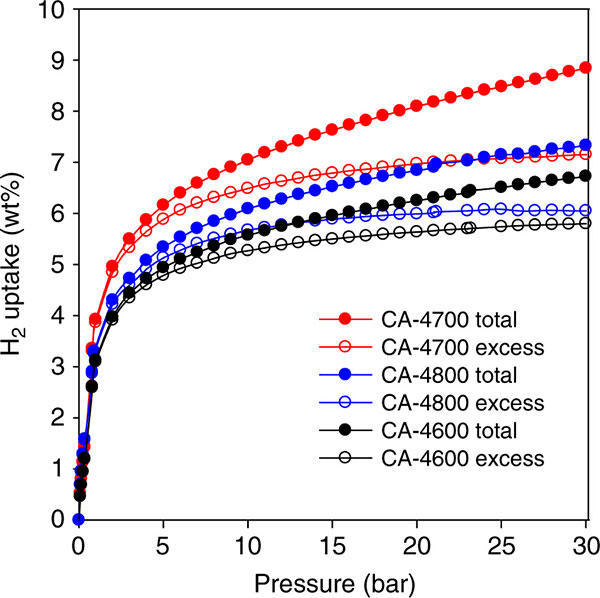 活性炭中的氫儲存需要具有最高表面積和適當尺寸的孔的材料。在-196和25℃下使用重量法在HidenXEMIS分析儀上在0-30巴的壓力范圍內(nèi)研究活性炭的儲氫能力。圖2顯示了活性炭在-196℃下的過量和總氫吸收等溫線。對于所有CA-4T活性炭,氫吸收是可逆的,沒有滯后現(xiàn)象,并且在0-30巴的壓力范圍內(nèi)沒有達到飽和。我們首先注意到1巴的氫吸收非常令人印象深刻,在3.1-3.9wt%的范圍內(nèi)。這種儲氫比為高表面積活性炭傾向于在2-3重量%范圍內(nèi)的任何報告的值高得多。我們將這種特別高的吸收特性歸因于非常高的微孔表面積和富氧表面的組合,特別是對于3.9重量%的活性炭樣品CA-4700。富氧表面的效果是對于活性炭樣品CA-4600,其盡管具有適度總表面積和微孔表面,仍然表現(xiàn)出的吸收比以前發(fā)現(xiàn)的活性炭材料具有高得多的表面積。經(jīng)過研究發(fā)現(xiàn),具有氧官能團的活性炭效果預期在低壓下具有最大效果,其中氫和表面之間的相互作用比在較高壓力下更重要,其中通過空間填充機制更可能發(fā)生氫吸收。