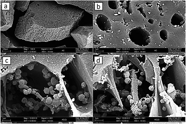 圖中(a)單個多孔活性炭在100倍放大的視圖,(b)高度多孔,不規(guī)則結(jié)構(gòu)化活性炭C在10000倍放大倍數(shù)下的特寫視圖,(c)和(d)細菌批量培養(yǎng)后,放大10000倍,負載固定在活性炭上。