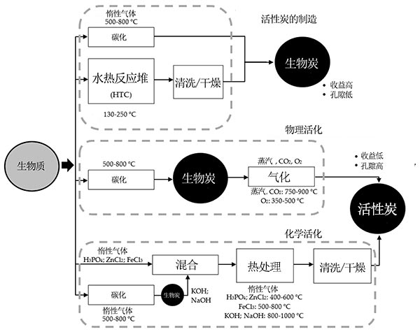 一般而言,活性炭吸附劑可以由其組成中具有高比例碳的任何前體制造。因此,生物質材料是活性炭吸附劑的理想前體。在這項研究中,生物質在熱處理后得到生物炭,生物炭經過進一步活化,而在活化步驟后獲得活性炭。常見的生物質材料如橄欖核等等。圖2顯示了生物質的活性炭制造方法。生物炭通常在碳化時制備,而活性炭需要使用物理和化學活化產生更加發(fā)達的孔隙。合成的活性炭的孔隙率,表面化學和產率高度依賴于起始生物質組成和合成中使用的操作條件。