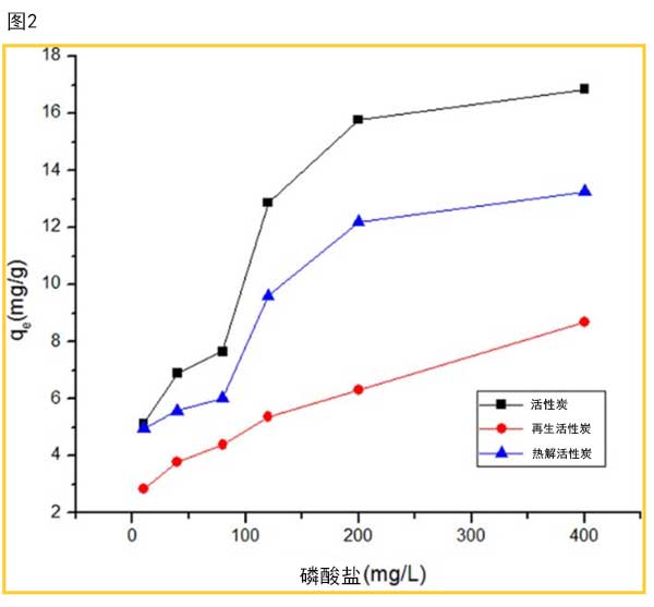 為了評(píng)估再生活性炭的性能,研究了磷的吸附性能。在該研究中,通過改變磷酸鹽的初始濃度(20℃)來(lái)測(cè)試活性炭,再生活性炭和它的吸附容量。圖2顯示了一般趨勢(shì),即吸附容量隨初始P濃度的增加而增加,直至達(dá)到飽和狀態(tài)。
