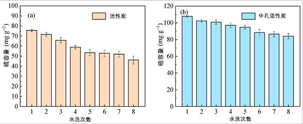 為了比較水洗再生對(duì)脫硫后活性炭樣品的影響,研究了硫容量與活性炭和中孔活性炭的循環(huán)次數(shù),如圖3所示。活性炭的工作硫容量總體呈下降趨勢(shì),第一次脫硫時(shí)為75.6 mg·g-1,第8次循環(huán)為46.2 mg·g-1,減少率為40.5%,如下圖所示。圖3a。結(jié)果表明,飽和吸附劑對(duì)H 2 SO 4的不完全解吸對(duì)循環(huán)SO 2有明顯的負(fù)面影響活性炭的吸附性能。用中孔活性炭觀察到類似的結(jié)果。然而,中孔活性炭的硫容量在8個(gè)循環(huán)后降低了22.0%,遠(yuǎn)低于微孔活性炭的降低速率,這表明互連微孔和有序介孔的特性促進(jìn)了H的解吸。2 SO 4并減少硫容量的減少。