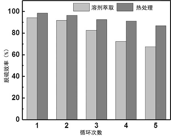 在吸附脫硫中使用的各種方法中,溶劑萃取和熱處理被認(rèn)為是常用的再生方法。在這項實驗中,溶劑萃取和熱處理都用于研究活性炭的再生性能。關(guān)于溶劑萃取方法,在第一次吸附循環(huán)完成后,通過外部磁體收集活性炭,并通過添加甲醇作為萃取溶劑進(jìn)行洗滌。然后,將活性炭干燥用于下一次運行。如在示出的圖3,它被發(fā)現(xiàn)的活性炭可在前兩次運行時通過溶劑洗滌輕松再生。這可能是因為物理吸附在吸附過程中占主導(dǎo)地位,并且由污染引起的大多數(shù)失活吸附劑可以通過溶劑萃取方法在初始循環(huán)中再生。然而,在連續(xù)五次再生操作后,吸附劑與新鮮吸附劑保持67%的初始脫硫效率(相當(dāng)于20.22mg DBT/g)。隨著循環(huán)次數(shù)的增加,活性更高的位點與DBT相互作用,并且后一次運行留下的活性位點更少,從而導(dǎo)致隨后的再生運行中脫硫效率降低。為了提高活性炭吸附劑的再生效果,引入了熱處理方法。通過溶劑萃取再生后,將獲得的活性炭在氮氣氛下在350℃下活化1小時來恢復(fù)活性。