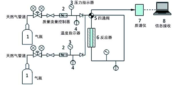 在我們之前的工作中開發(fā)了吸附裝置來測量氣體穿透曲線(圖1)。它由三個主要部分組成:準備部分、吸附段和分析部分。在氣體制備部分中,吹掃氣體是高純度Ar氣體(99.999%),其用于在引入烴氣體之前通過惰性氣體管線和反應器吹掃系統(tǒng)。吸附部分使用丙烷或乙烷在氦氣或人造氣體混合物,其通過燃料氣體管線和反應器。這兩條線都碰到了一個四端口交叉閥。整個裝置等溫(~26℃)。閥門位置,氣體流量,壓力和溫度完全自動化,并由內(nèi)部程序控制。通過質(zhì)譜儀分析和量化來自反應器出口的氣體。