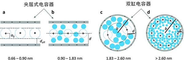 (1)對(duì)于亞納米孔(<2nm)的恒定電容的假設(shè)與許多觀察結(jié)果相矛盾并且過(guò)于簡(jiǎn)單化。已經(jīng)在許多場(chǎng)合觀察到電解質(zhì)離子在1nm以下的孔中的限制作用。