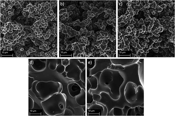 通過(guò)掃描電子顯微鏡對(duì)高比表面積活性炭進(jìn)行表征于圖2a-c中。可以看出的是這幾種活性炭具有它是由球形碳顆粒的尺寸與周?chē)?μm的孔隙網(wǎng)絡(luò)結(jié)構(gòu),這是典型的基于甲醛樹(shù)脂活性炭。球形活性炭納米顆粒的燒結(jié)導(dǎo)致孔隙網(wǎng)絡(luò)內(nèi)的空腔,其在直徑為2至20μm的形成。活性炭表面是光滑的,沒(méi)有燒結(jié)的球形活性炭納米顆粒,而它們?nèi)匀辉诰W(wǎng)絡(luò)內(nèi)具有相似直徑的空腔。由于在化學(xué)活化之前低的預(yù)碳化溫度,球形納米顆粒在活化過(guò)程中強(qiáng)烈聚集,這導(dǎo)致如前所述的較不剛性的孔隙網(wǎng)絡(luò)。