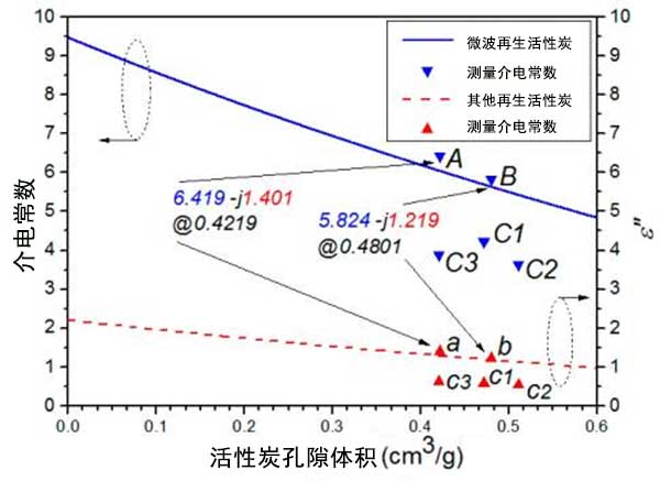 該研究為連接復(fù)介電常數(shù)和活性炭孔容提供了橋梁。此外,它能輔助活性炭達到快速表征提供了一種方便的方法。在未來的研究中,我們將嘗試在推導(dǎo)過程中考慮微波因子,并研究活性炭d介電常數(shù)和孔徑分布或不同吸收性(孔隙率)之間的關(guān)系。