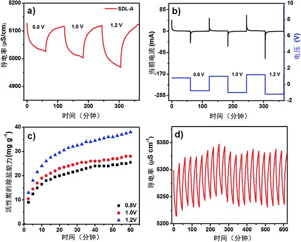 在充電步驟期間,在兩個(gè)電極上向膜電容去離子施加正電勢(shì),以從已知NaCl濃度的溶液中吸附離子,并施加負(fù)電位以使電極放電并排出廢物流中的離子。圖4a顯示了在NaCl溶液中0.8V至1.2V的各種電位下,活性炭在初始濃度2500mg L-1下的脫鹽性能。在所有施加的電位中,在充電期間首先觀察到溶液電導(dǎo)率的急劇下降,并且當(dāng)吸附接近平衡時(shí),電導(dǎo)率的變化減小直至達(dá)到平臺(tái)。圖4b示出了具有增加電勢(shì)的正相關(guān)電流瞬變,而圖4c顯示了活性炭電極在不同施加電位下的鹽吸附容量。從0.8V到1.2V,鹽吸附容量從23增加到38mg g-1,表明更高的電池電位可以提高電吸附能力。觀察到的現(xiàn)象可歸因于強(qiáng)靜電力的存在以及在增加的電壓下形成較厚的雙電層。圖4d示出了活性炭電極的循環(huán)穩(wěn)定性,在2500mg L-1的NaCl溶液超過20次充放電循環(huán)而沒有去除能力任何明顯的損失。該結(jié)果證實(shí)了使用活性炭當(dāng)電極可以再生和重復(fù)使用而沒有任何損耗,活性炭是成為用于膜電容去離子應(yīng)用的電極材料的好材料。