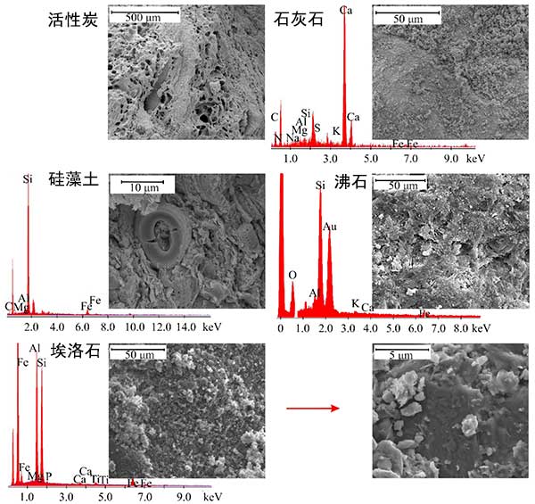 掃描電子顯微鏡(SEM)圖像和反應(yīng)材料的化學(xué)微范圍分析(EDS)如圖2所示。值得注意的是,活性炭樣品具有大膨脹的多孔表面,內(nèi)部孔隙的尺寸達(dá)到十幾微米到幾百微米。石灰石砂的SEM分析證實(shí)了這種材料的碳酸鹽特征,而鈣和氧的微區(qū)化學(xué)分析指向方解石(CaCO 3))。SEM-EDS分析表明硅藻土樣品中存在來(lái)自二氧化硅基團(tuán)的礦物,并允許將該材料的巖相分類為硅藻土。SEM微圖像證實(shí)了中等發(fā)展的沸石和埃洛石的表面,并且在后一種材料的情況下,存在特征性的納米管,然而,在該放大率下不是非常明顯。此外,EDS光譜指出沸石樣品中存在:硅(Si),氧(O),鋁(Al),鉀(K),鈣(Ca)和鐵(Fe),以及:鐵(Fe) ,埃洛石樣品中的鋁(Al),硅(Si),鎂(Mg),磷(P),鈣(Ca)和鈦(Ti)。