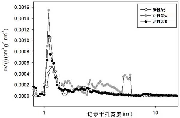 可以觀察到,由于在解吸分支中形成的小磁滯回線,活性炭普遍具有微孔性,這表明毛細孔凝結很小,因此中孔的量較少。通過QSDFT方法獲得這幾種活性炭的總體積和孔徑分布,假設孔為狹縫圓柱形。圖2顯示了三種研究的活性炭的孔徑分布,可以確認,對于所有活性炭樣品,主要存在于1.0-1.5nm區(qū)域的微孔,而對于活性炭A,也可以檢測到少量的中孔。