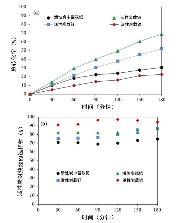 圖3:在120℃的氫中預(yù)處理的幾種活性炭催化劑的總轉(zhuǎn)化率(a)和炔烴(b)對時間的選擇性。