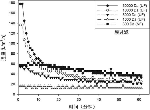 在膜過濾測試中,使用四個UF膜和一個NF膜。研究了1小時的通量變化,并監(jiān)測了降低的通量。在UF膜觀察到較高的通量降低。過濾1小時后,隨著截留分子量從50,000 Da減少到1,000 Da,通量下降也減少了。對于10,000 Da UF膜,在初始通量1小時過濾后損失了82%的通量。1,000 Da UF膜顯示出較低的通量在圖2顯示?讖绞怯绊懩み^濾通量的最重要參數(shù)之一,也是影響活性炭吸附能力的參數(shù)。通量也受膜結(jié)構(gòu),水中成分和廢水pH的影響。有些膜有很高的同量主要是由于膜表面與廢水成分之間的靜電相互作用。
