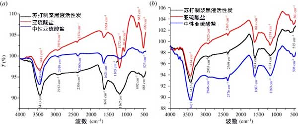FTIR光譜和SEM在表面功能基團并根據(jù)該制漿工藝的研究基于活性炭的形態(tài)學的變化在圖2示出。關于FT-IR光譜(圖3a,b),很明顯活性炭的表面具有強帶,其分配為酚木質素,羧酸或吸附水的OH伸縮。因為蘇打制漿導致從原料中更高的二氧化硅去除,并且因此黑液中的二氧化硅含量更高。發(fā)現(xiàn)不同官能團為特征的活性炭表面已準備好進行吸附過程。