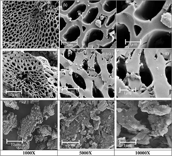 FESEM:三種活性炭在不同放大倍數(shù)下的顯微圖像顯示在圖3中?展钚蕴繕悠樊a(chǎn)生的蜂窩狀圖案孔隙網(wǎng)絡(luò)與優(yōu)化的碳納米管相似。油棕纖維活性炭上的孔也類似于空果束活性炭的蜂窩圖案。然而,與油棕纖維炭和棕櫚仁殼炭相比,空果束炭中的孔網(wǎng)絡(luò)更加突出和發(fā)展。棕櫚仁殼活性炭樣品顯示出很少的隧道孔,并含有阻塞毛孔的可見(jiàn)微塊。發(fā)達(dá)的多孔網(wǎng)絡(luò)表明可以沉積吸附物或離子的高表面積。