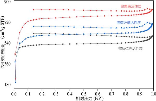 BET表面積和孔徑分布:所述吸附物在物理吸附過(guò)程中使用是氮?dú)。吸附和解吸等溫線用于估計(jì)每個(gè)活性炭的表面積和孔分布。圖5顯示了三種活性炭的等溫線圖。在低相對(duì)壓力下在所有樣品上觀察到開(kāi)放式II型滯后曲線。據(jù)說(shuō),當(dāng)前體碳化過(guò)程中不完全燃燒導(dǎo)致孔隙收縮時(shí),這種開(kāi)口性和低相對(duì)壓力下的低吸附性隨著相對(duì)壓力的增加而增加]。